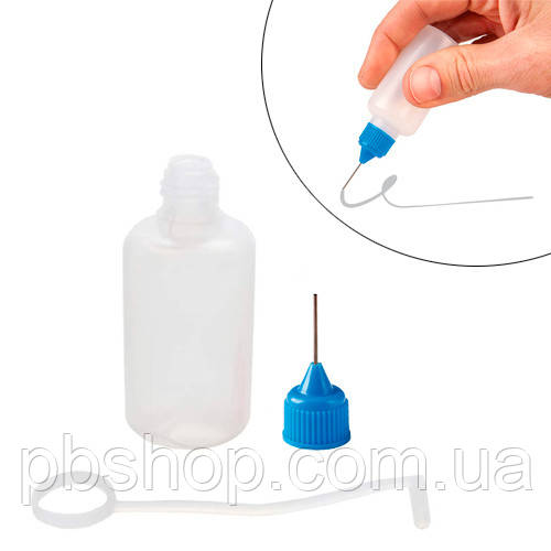 Прозора пластикова пляшечка з тонким металевим носиком для точного та рівномірного нанесення клею, флюсу, олії для змащення тощо. Комплектується силіконовою кришечкою-заглушкою, яка вбереже вміст від впливу з повітрям і не дасть йому протікти.